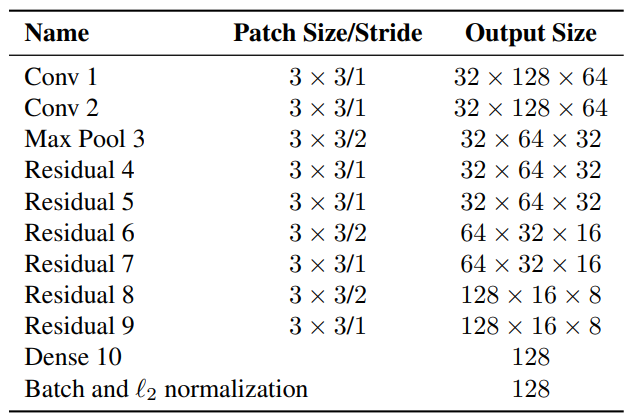 차원 수가 128인 전역 feature map은 10번째 dense layer에서 계산된다. 이후 최종적으로 batch normalization과 L2 normalization을 적용, feature 벡터를 코사인 거리 기반 외형 기반 척도와 호환되도록 한다.