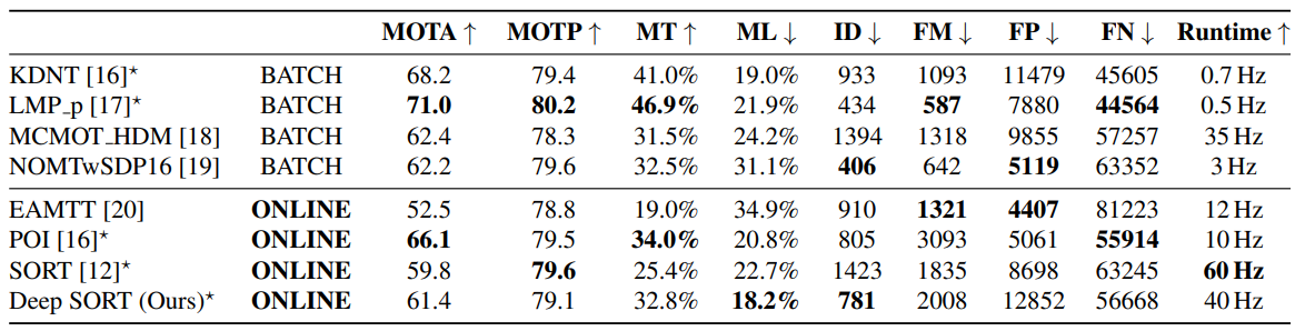 - Faster R-CNN 검출 결과를 사용하여 SORT와 공정하게 비교.