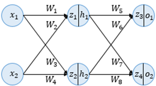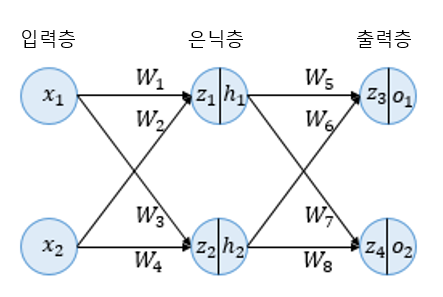 이 인공 신경망에서 입력 데이터(x1, x2)를 받아 최적의 출력 데이터(o1, o2)를 계산할 수 있는 각 퍼셉트론의 가중치(w1~w8)들을 업데이트하는 과정을 신경망 학습이라고 할 수 있겠다.