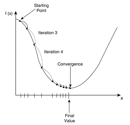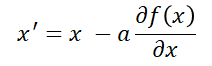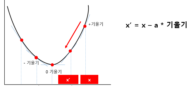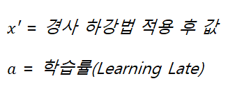현재 x값에 현재 x값에 대한 기울기만큼 이동하여 극점으로 점점 이동하는 x'를 구하게 된다. (이때 a는 움직이는 거리 비율, 학습률)