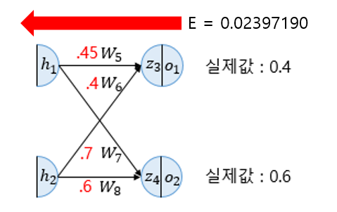 계산 결과, 역전파 후 가중치를 업데이트하여 오차가 줄어든 것을 볼 수 있다.