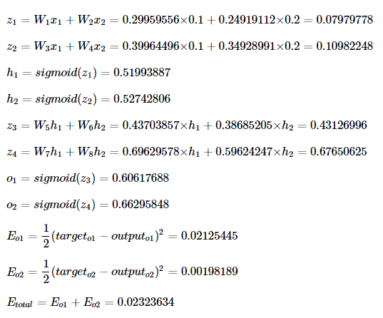 z1 = w1 * x1 + w2 * x2 = 0.3 * 0.1 + 0.25 * 0.2 = 0.08