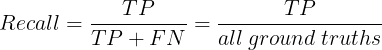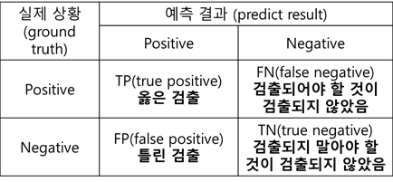 Recall은 재현율이라고 하며, 검출해내야 하는 물체들 중에서 제대로 검출된 것의 비율이다.