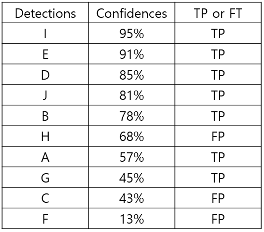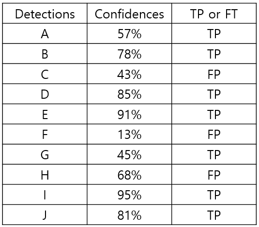 예로 15개의 Object가 있는 dataset에 모델에 의해 10개를 Detection 했을 때, 이에 대한 Confidence와 검출 결과(TP or FT)에 대한 표를 다음과 같이 작성할 수 있다.