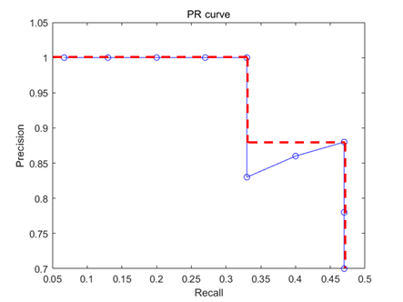AP(Average Precision)는 Recall 값들에 대응하는 Precision 값들의 평균이다. 구하는 방법은 PR 곡선의 아래쪽 면적을 구하면 된다.