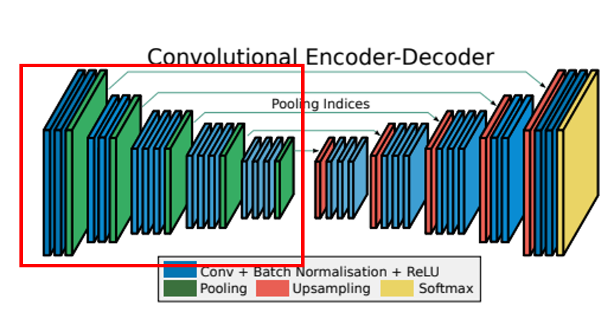 SegNet 구조의 왼쪽 부분을 Encoder라 하며, Encoder에서는 VGG16의 13개 Convolution Layer을 동일하게 사용한다. Convolution, Pooling 구조들 통해 Input Image의 특징 맵(featrue map)을 추출하게 된다.