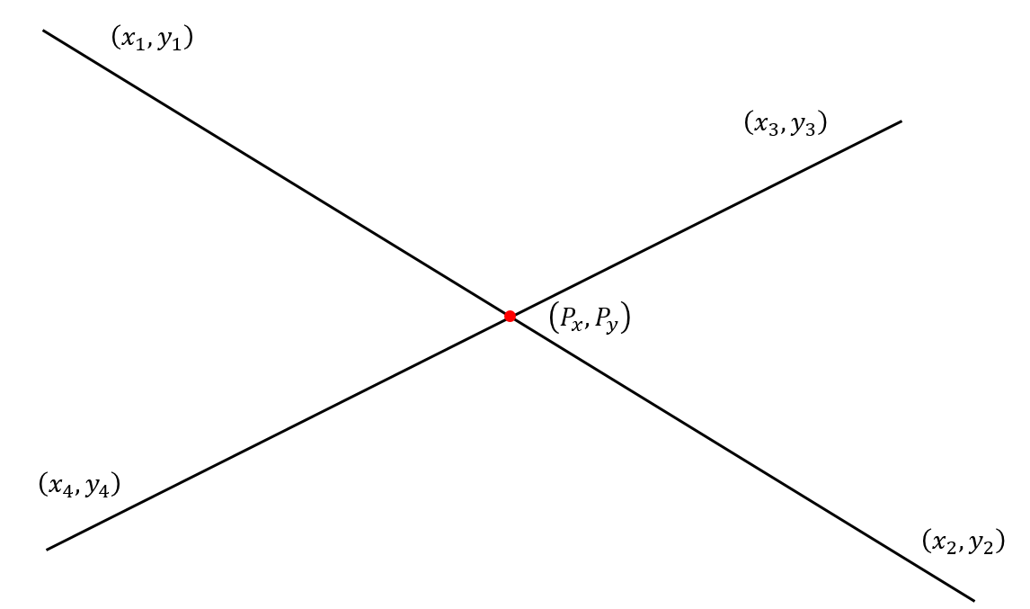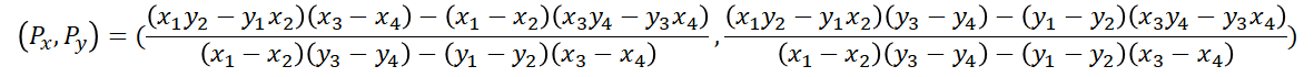 두 점 (x1, y1), (x2, y2)를 지나는 직선 A와 (x3, y3), (x4, y4)를 지나는 직선 B의 교차점 P는 다음과 같다.