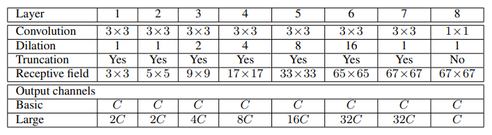 - Context Module은 Dilation Factor(1, 1, 2, 4, 8, 16, 1)와 3 x 3 convolution을 적용하는 7개의 Layer가 있다.