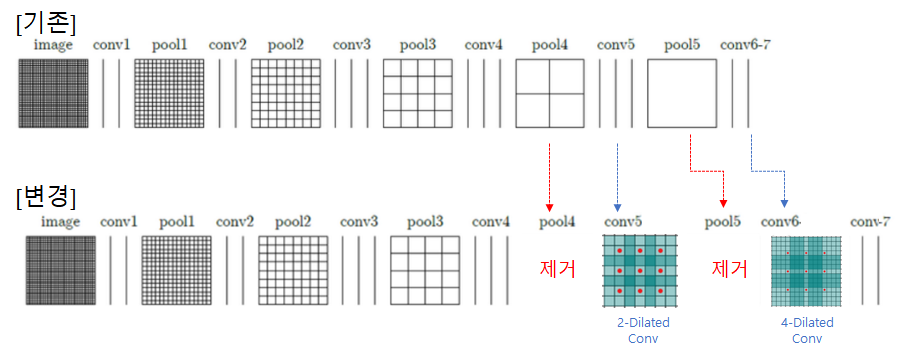 - FCN에서는 VGG-16 network의 뒷단을 그대로 사용했지만, Front-end module은 뒤 2개의 pooling layer를 제거하고 따라오는 convolution layer를 dilated convolution으로 대체하였다.