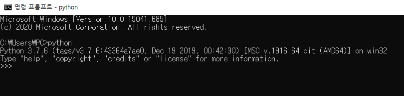 cmd 창에서 python을 입력하여 위와 같이 동작한다면 설치 완료.