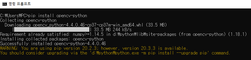 이를 이용해 OpenCV를 설치. (pip install opencv-python 을 cmd 창에 입력)