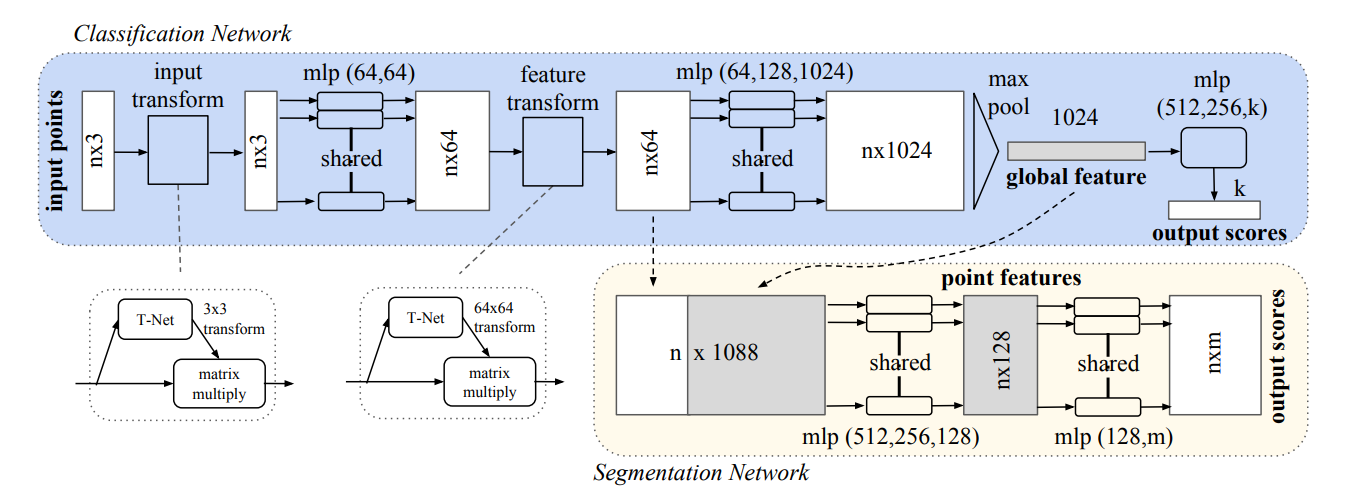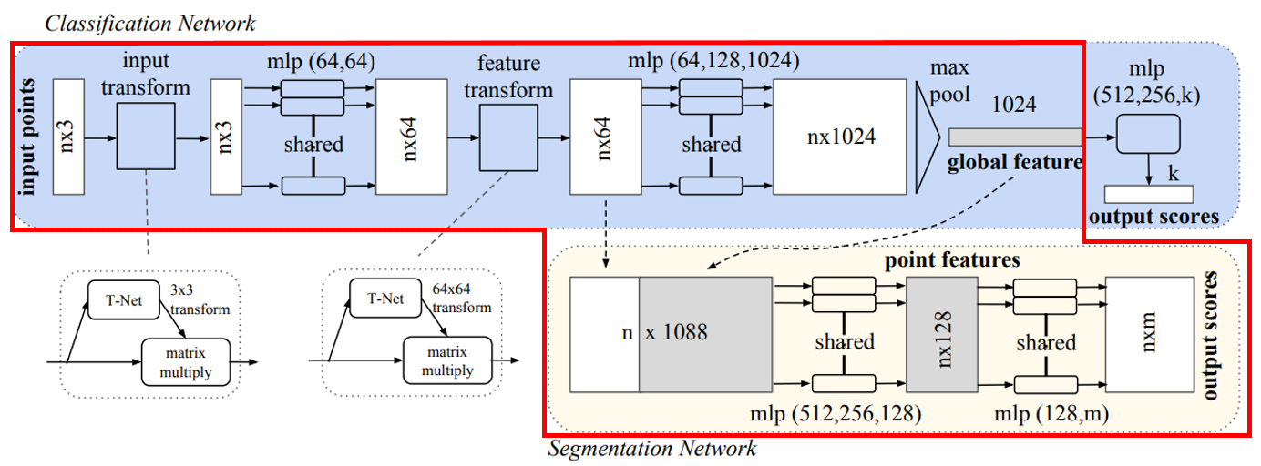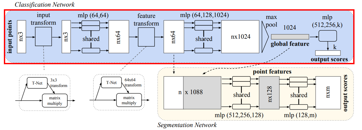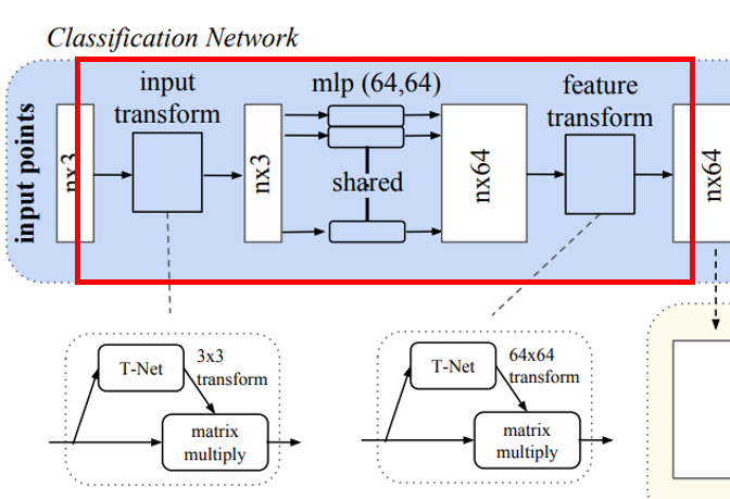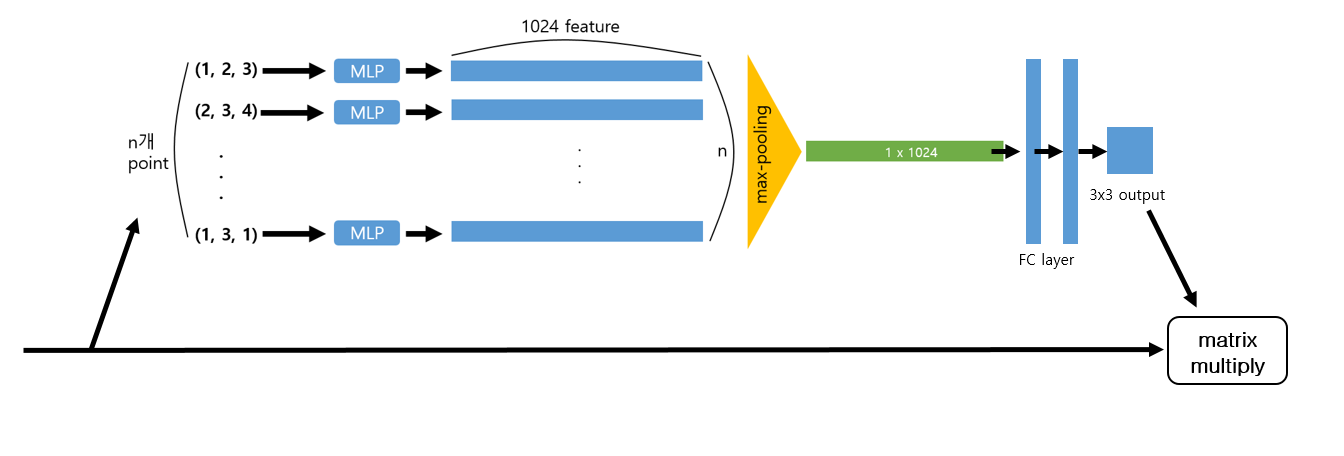 - 위 그림과 같이 T-Net에서는 STN에서와 같이 mini pointNet을 통해 transformation matrix를 계산.