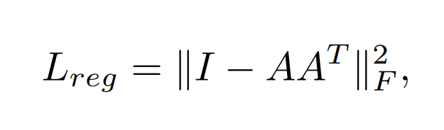 A와 직교 행렬 A^T는 서로 곱하면 I가 되기 때문에, I와의 차의 절댓값이 작아지는 쪽으로 학습하면 A는 원래 구하려는 transform matrix에 근사해지기 때문에 위와 같은 정규화 식으로 A를 구한다.