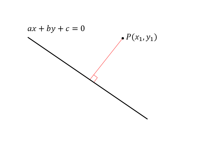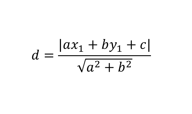 직선 ax+by+c=0 과 점 P(x1, y1)사이의 거리 d를 구하는 공식은 다음과 같다.