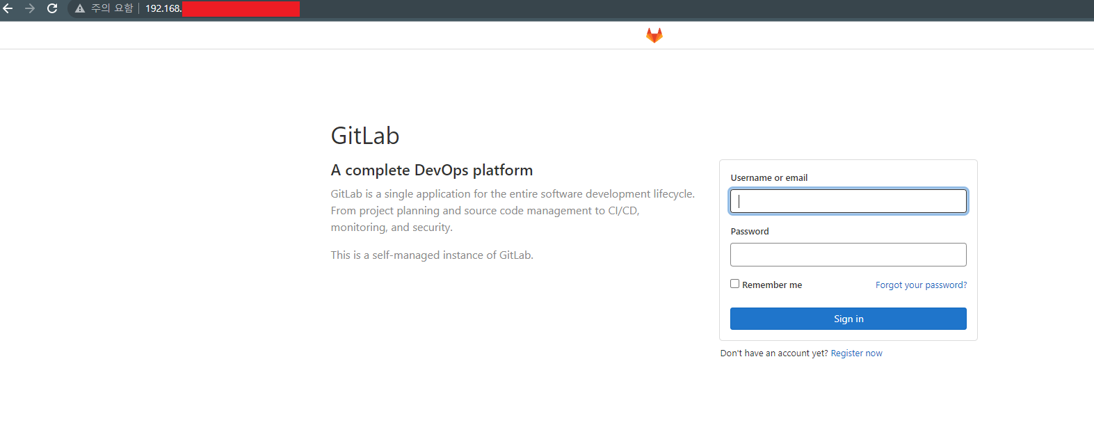 - 해당 ip로 접속하면 다음과 같이 GitLab 로그인 페이지 접속.