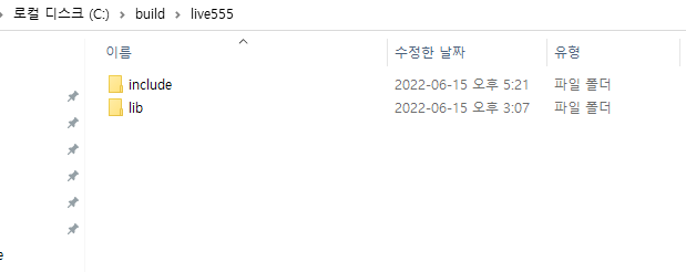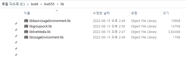 - BasicUsageEnvironment, groupsock, liveMedia, UsageEnvironment의 각 .lib 파일을 한 lib 폴더에 복사.