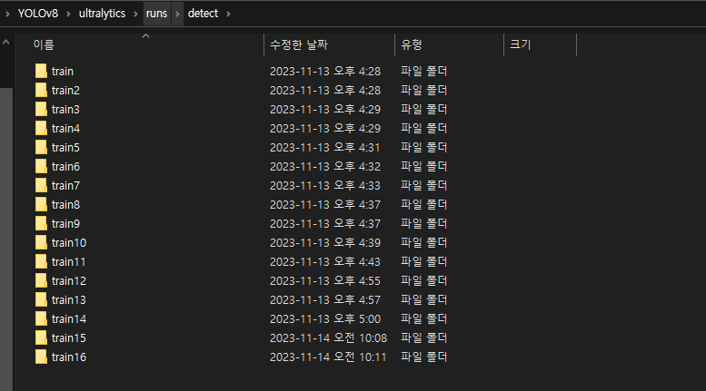 - ultralytics/runs/detec/ 경로 아래 학습 완료 파일이 저장된다.