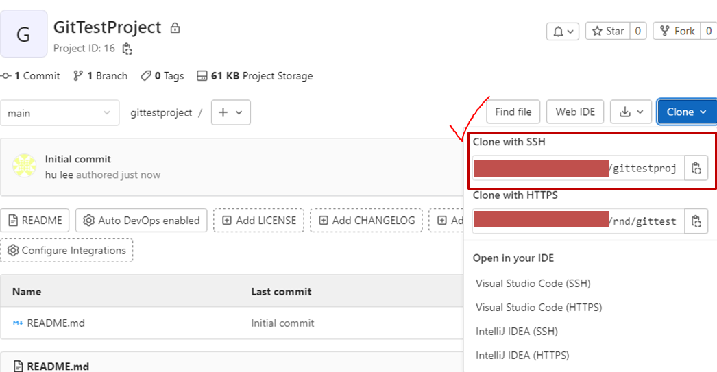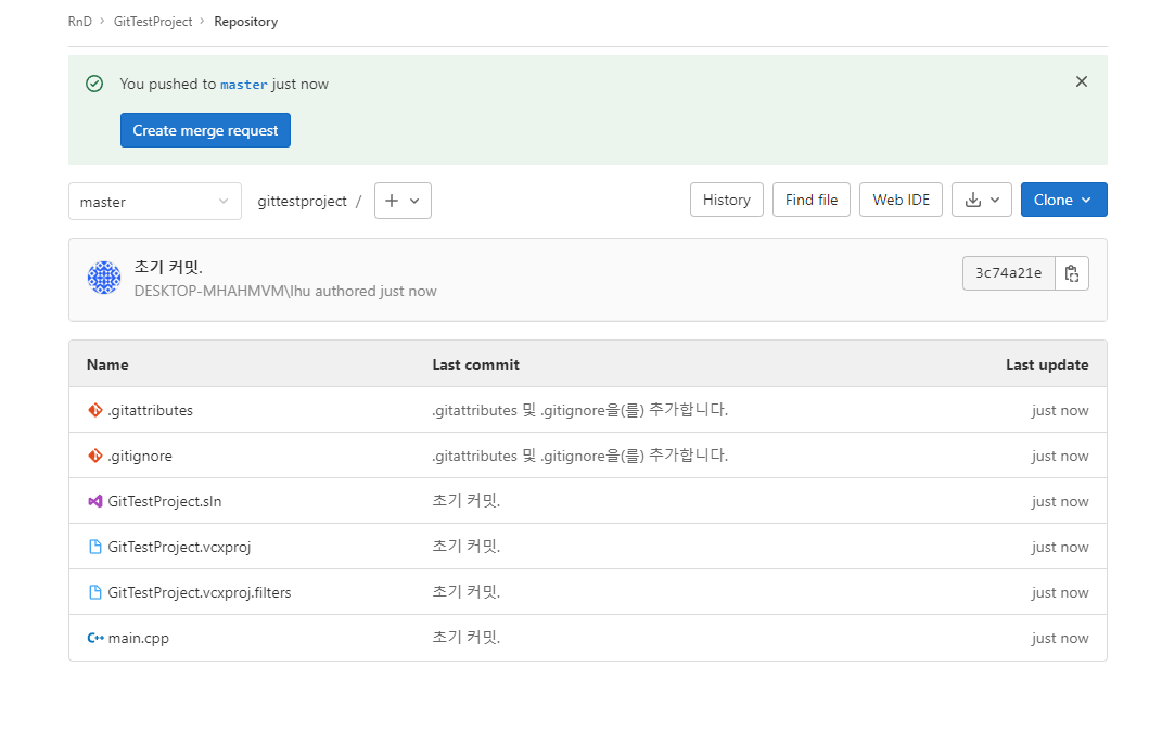 - master 브랜치가 만들어지면서 GitLab(원격저장소)에 푸시된다.