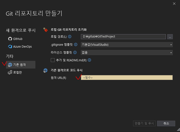 - 커밋 후 '보내는 항목' -> 푸시를 클릭하여 GitLab(원격저장소)에 푸시.