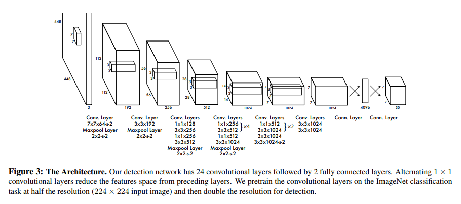 - Yolo model은 24개의 Convolution Layer들과 2개의 Fully Connected Layer로 구성.
