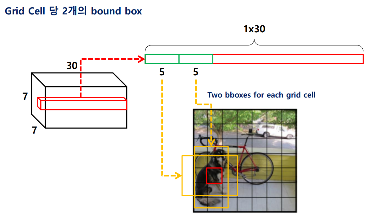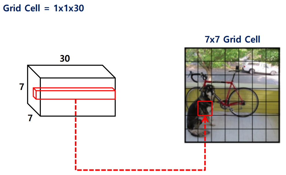 1) Grid Cell 하나는 아래와 같이 1x1x30 크기의 tensor로 표현.