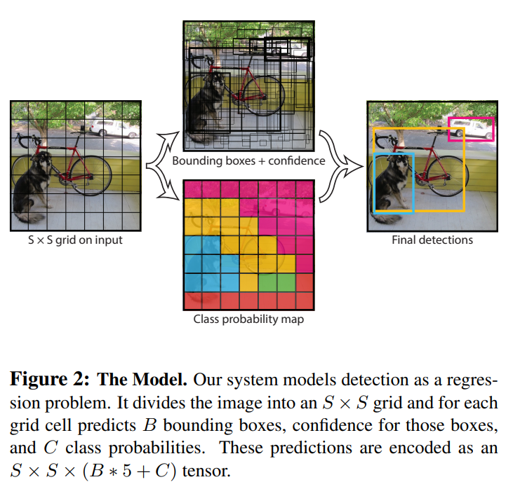 1) 입력 이미지를 S x S Grid로 나눈다. 물체(bbox)의 중심이 Grid cell에 들어가면 해당 Grid cell이 해당 물체를 감지하는 역할을 한다.