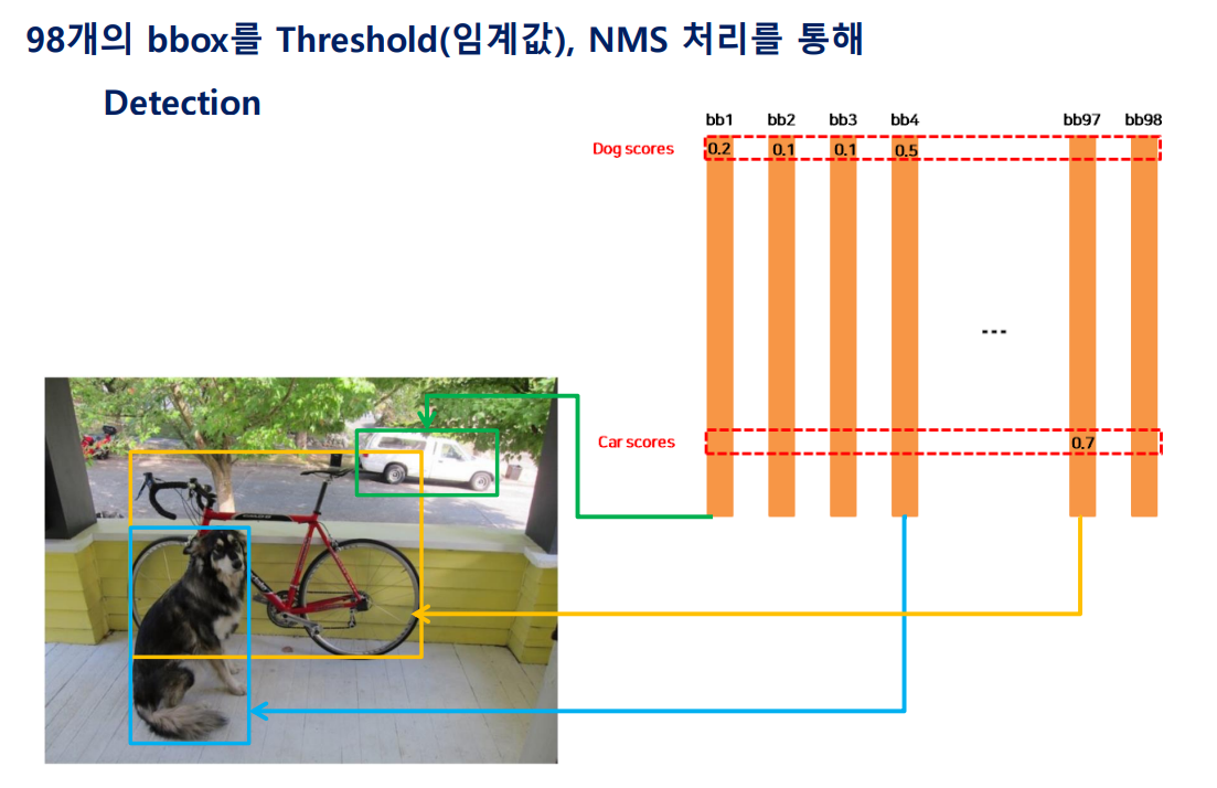 5) 이후 각 bbox 정보에 대해 Threshold, NMS 처리를 통해 최종적인 Object Detection 결과를 도출.
