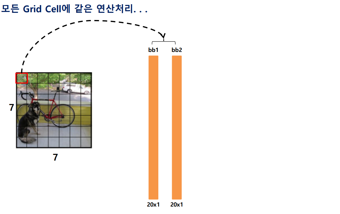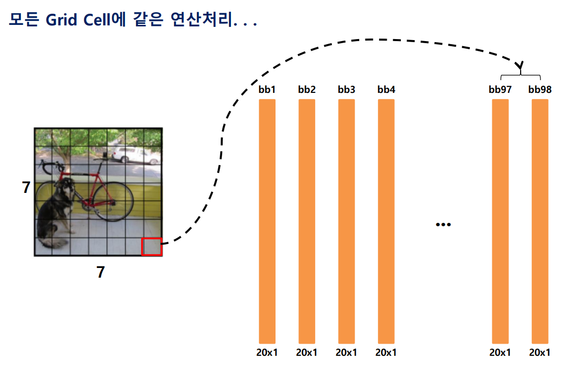4) 모든 Grid cell에 대해 같은 연산처리를 하면 7x7x2=98개의 bbox 정보를 가지게 된다.