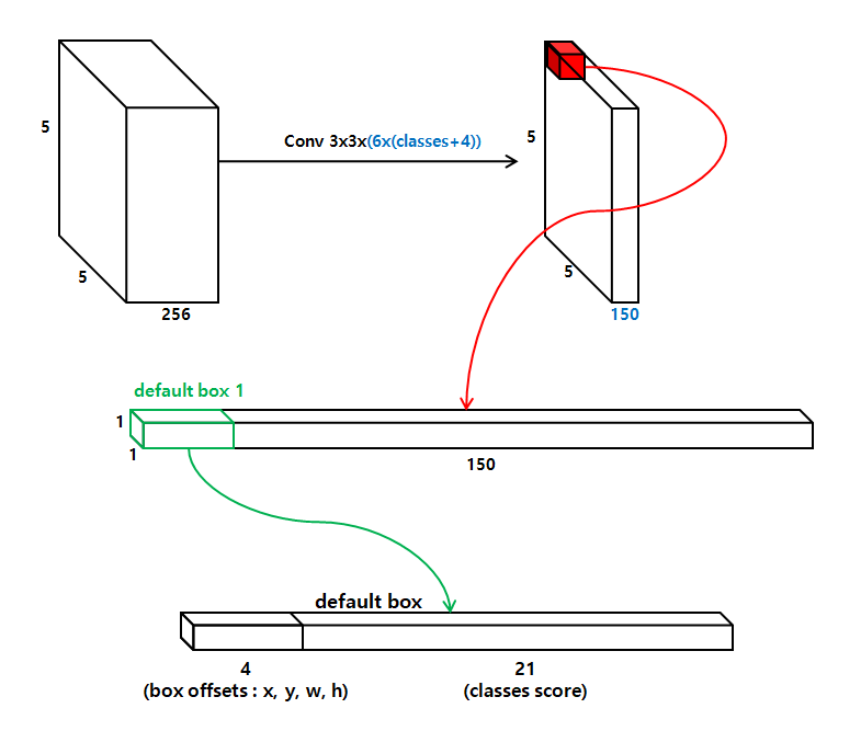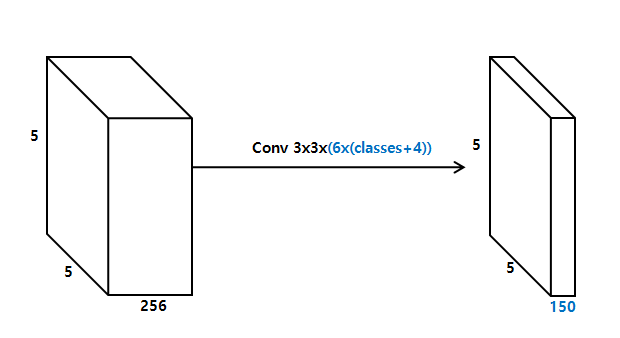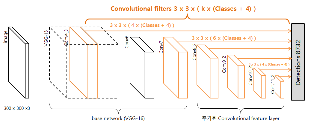 - 구체적으로, 주어진 위치에 있는 k개 중 각 box에 대해 c 클래스 점수와 원래 default box 모양을 기준으로 4개의 offset을 계산.