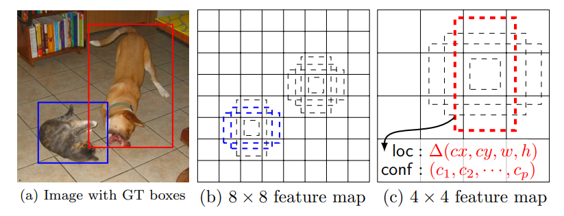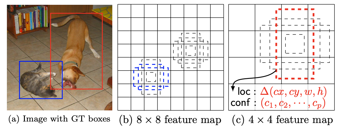 - 위 그림의 8x8 feature map과 4x4 feature map에서 같은 크기의 커널이 감싸는 영역은 scale 면에서 차이가 나기 때문에 서로 다른 크기의 객체 탐지를 용이하게끔 학습한다.