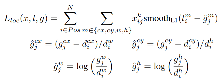 - localization loss는 predict box(l)와 ground truth box(g) 사이의 Smooth L1 손실이다.